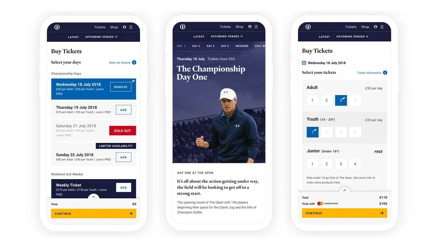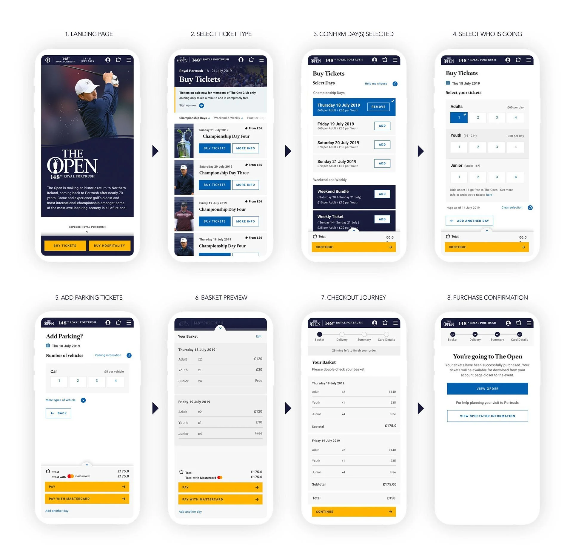 A mobile user journey to purchase a ticket for The Open from arriving on the home page to confirmation.