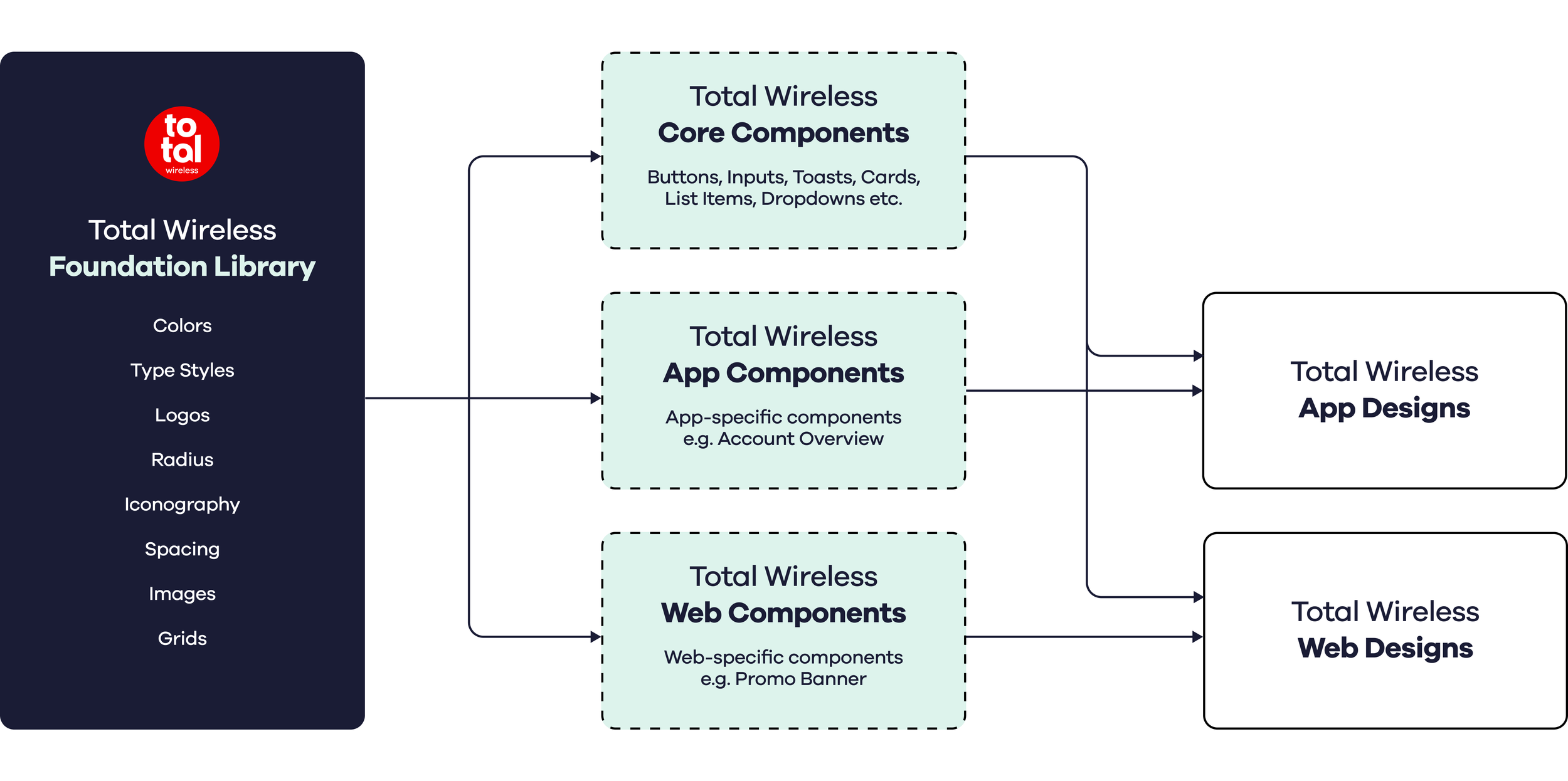 During this project, we utilized and contributed to a larger design system that encompassed styles and core components for the Total Wireless web site, to ensure consistency across the platforms. We also created a component library specifically for the Total Wireless app, which pulled styles from the design system.