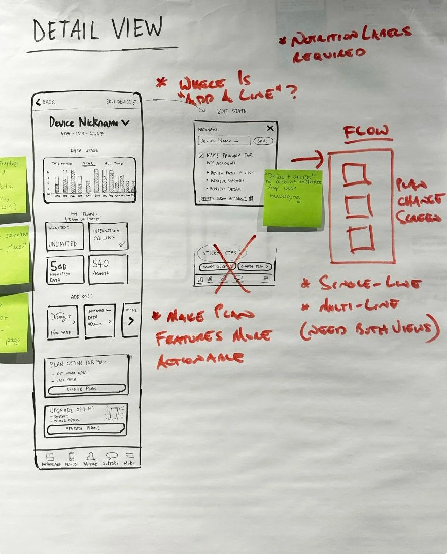 We led an in-person workshop with key team members from Total Wireless to deeply understand user pain points and the functionality limitations of the existing app. This included sketching exploration sessions, getting feedback from the team, which enabled us to iterate and narrow down our concepts, ready to begin high-fidelity designs.