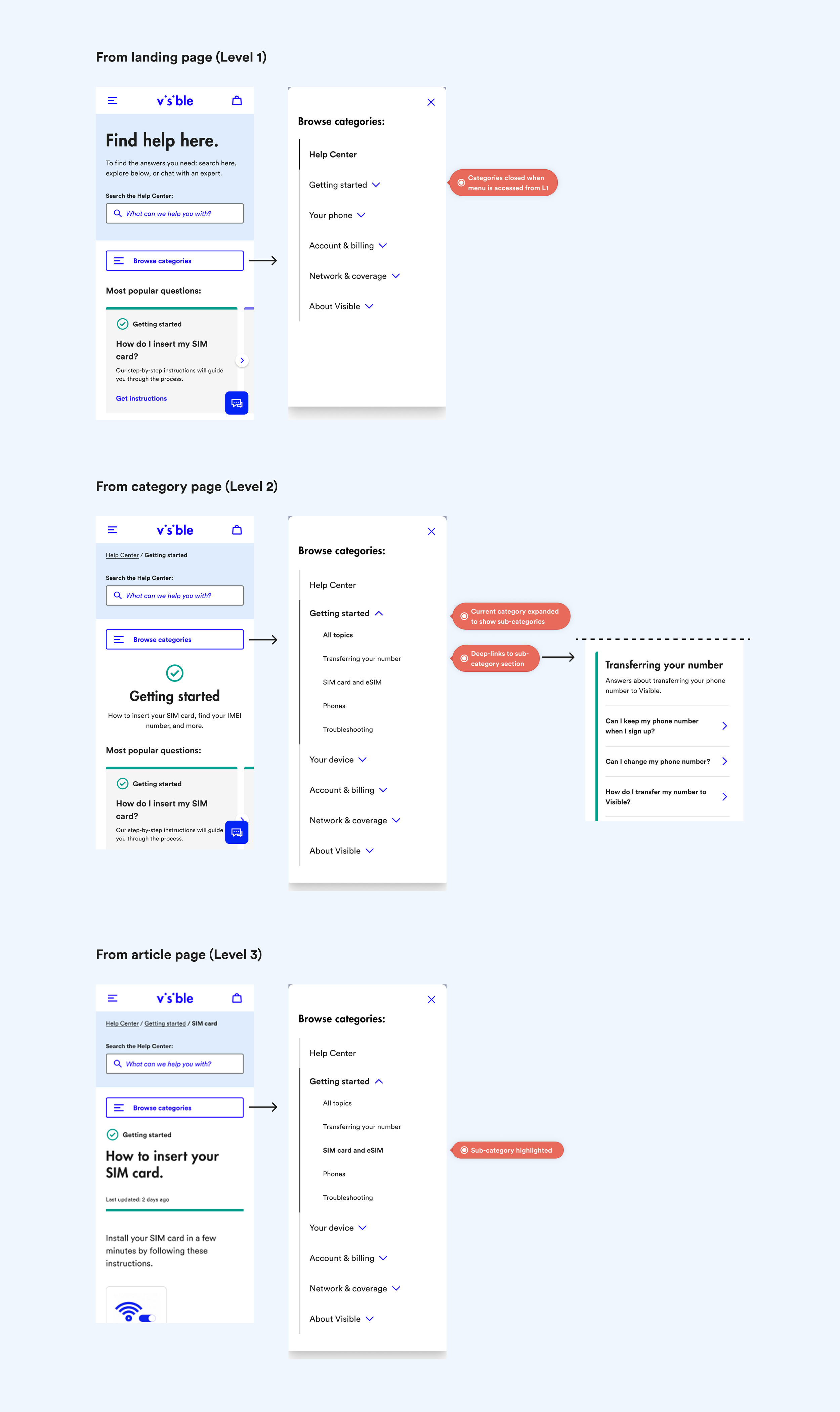 Category navigation allows the user to navigate within the help center, clearly indicating their current location, and let’s them expand categories and explore at sub-category level.