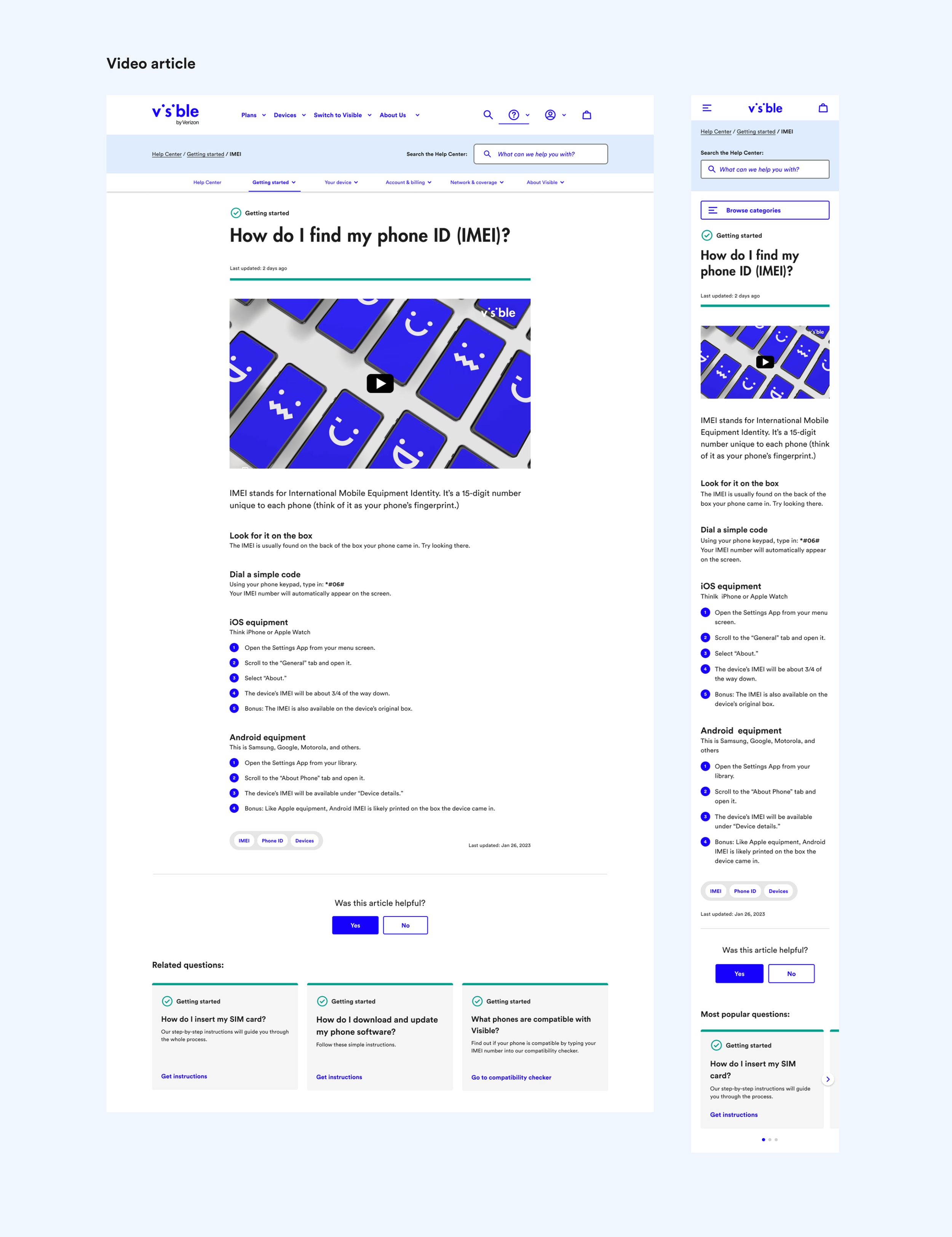 The Help Center landing page was given it’s own subtle visual branding to let customers know they are in a separate section of the Visible website. Key tasks a user needs to do are prioritized: searching for a specific issue or browsing the categories of the help center. Most popular questions were also surfaced at the top of the page for easy access. Each category was assigned a color and icon to allow for easy identification and orientation further into the help center.